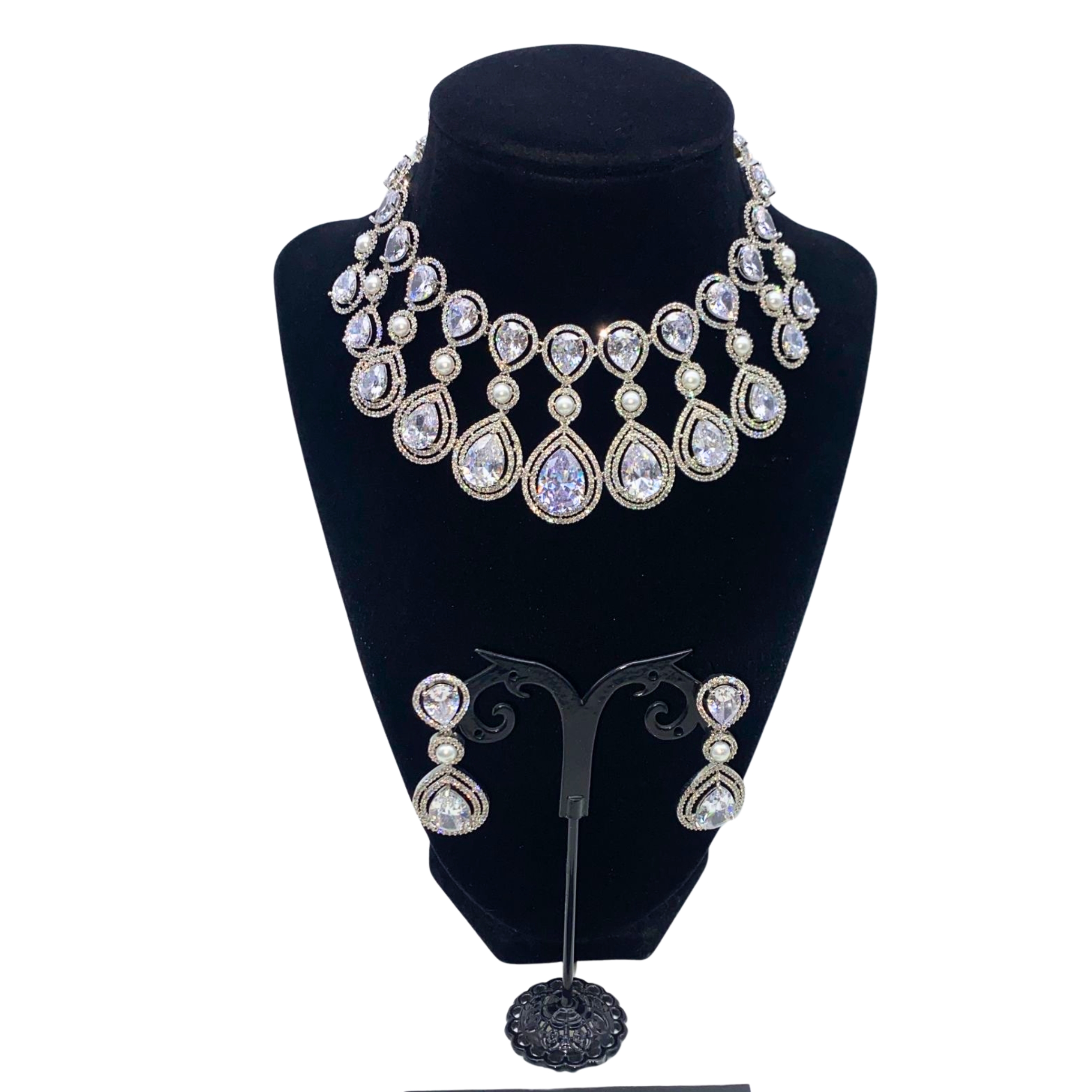 American Diamond hanging style jewelry set with pearls comes with two matching earrings.
