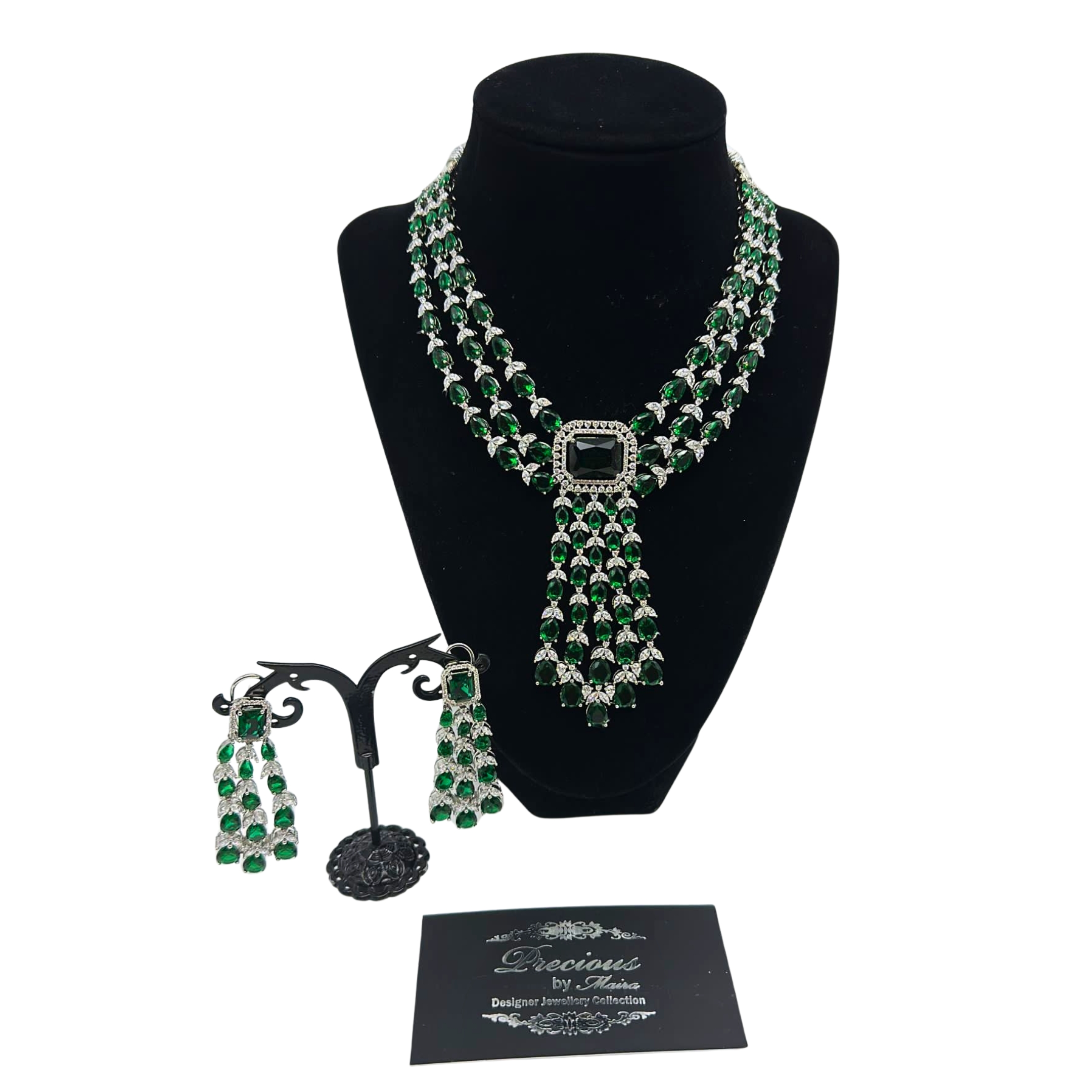 Intricately Designed American Diamond Set in Green Emerald comes with two matching earrings and tikka.